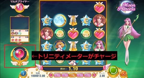 ムーンプリンセスのフリースピンはトリニティ機能(全シンボル消去)から発動します。3種類から選択でき、それぞれ特徴が異なります。