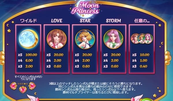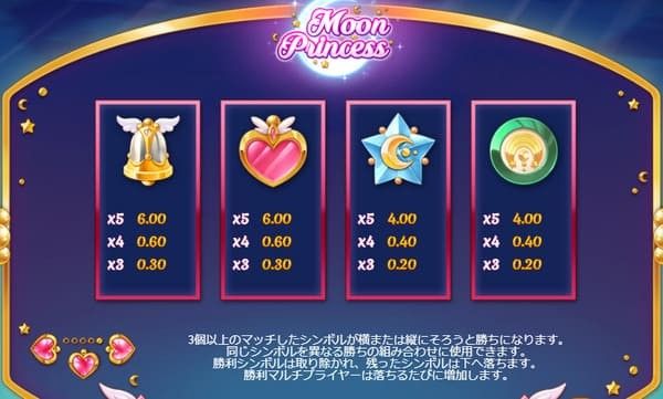 ムーンプリンセスのシンボルはプリンセス系(高配当)とアイテム系(低配当)に分かれています。縦または横に3個以上隣接で配当が成立します。