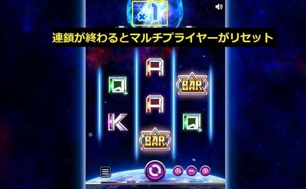画面上部にマルチプライヤーが表示されます(x1から開始)。配当が成立するたびにマルチプライヤーが+1上昇します(x1→x2→x3...)。