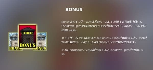 BONUSシンボル(刑務所の建物)の解説画面です。3つ以上出現するとLockdown Spins(フリースピン)に突入します。