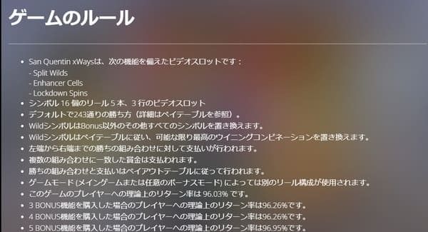 サンクエンティン(San Quentin xWays)のRTPは96.03%です。オンラインスロットの平均(約96%)とほぼ同程度の水準ですが、超高ボラティリティのため短期的な変動は非常に大きくなります。
