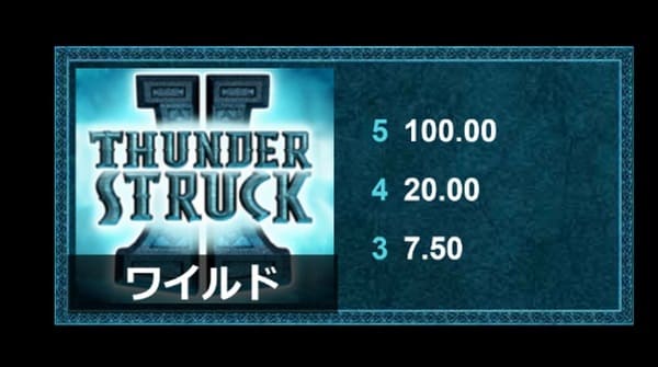 Thunderstruck IIロゴがワイルドシンボルです。 スキャッターを除く全てのシンボルの代用として機能し、配当成立をサポートします。 ワイルド自体も高配当シンボルであり、5つ揃えば最高額の配当が得られます。