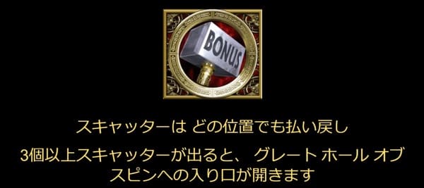 トールのハンマー(BONUS)がスキャッターシンボルです。 画面上のどこに出現しても有効で、3つ以上出現するとグレートホールオブスピン(フリースピン)に突入します。