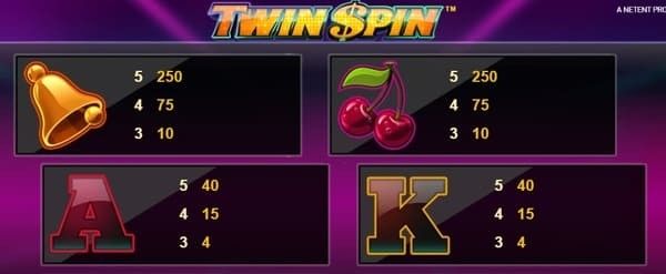 ツインスピンにはワイルドシンボルもスキャッターシンボルも存在しません。 すべての配当は通常シンボルの組み合わせのみで成立します。非常にシンプルな設計です。
