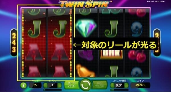 選ばれた2つのリールが完全に同じシンボルで回転します。連動リールは光って表示されます。