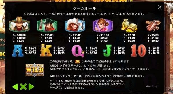 ワイルドウェストゴールドは5リール×4段で40本の固定ペイラインを採用しています。 ペイラインの本数が多いため、ベースゲームでも比較的配当が発生しやすい設計です。 ワイルドがリール2〜4に出現することで、さらに配当チャンスが広がります。