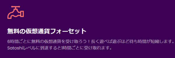 トラストダイスの最大の特徴のひとつがフォーセット(蛇口)です。 6時間ごとに無料で仮想通貨を受け取ることができ、入金なしでゲームを楽しめます。