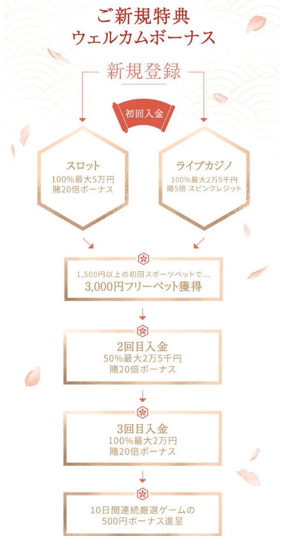 遊雅堂のウェルカムボーナスは3回の入金で最大10万円超の特典が受けられます。スロット用とライブカジノ用から選択可能です。