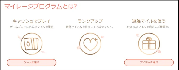 マイレージプログラムはプレイすればするほどレベルが上がり、より豪華な特典と交換できるようになります。遊雅ショップでは好みの特典を自分で選べるため、プレイスタイルに合わせた使い方が可能です。