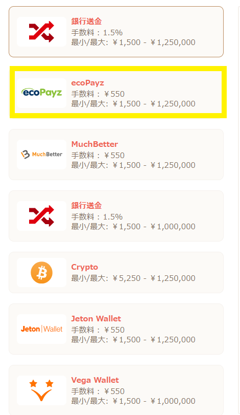 - 出金方法は銀行送金・仮想通貨・Payz・MuchBetter・Vega Wallet・Jeton Walletの6種類