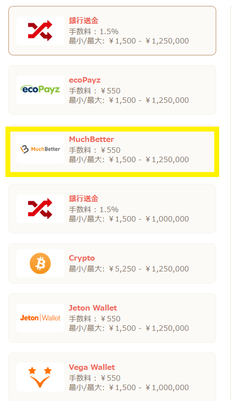 | MuchBetter | 550円(5,500円以上無料) | 1,500円 | 125万円 | 即時〜24時間 |