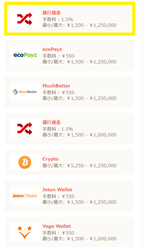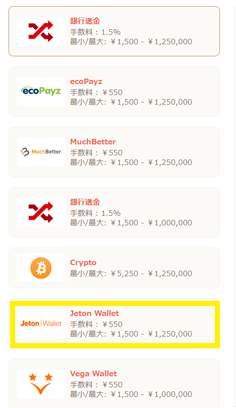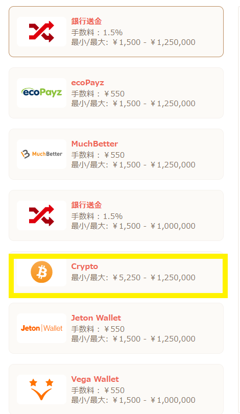 銀行送金・仮想通貨・Payz・MuchBetter・Vega Wallet・Jeton Walletの中から、ご希望の出金方法を選択してください。