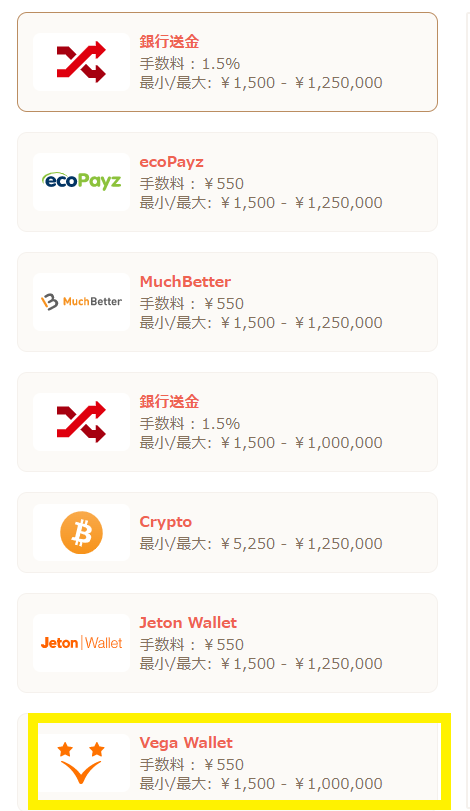Vega Walletは日本のプレイヤーに人気の電子決済サービスです。5,500円以上の出金で手数料が無料になります。最大100万円まで出金可能です。