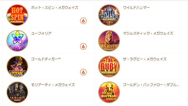 バカラ、ルーレット、ブラックジャックなどのライブゲームを提供しています。 メガルーレットなどマルチプライヤーで高配当を狙えるゲームも楽しめます。