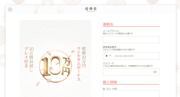 遊雅堂では、最大10万円のウェルカムボーナス(出金条件20倍)と、新規登録でフリースピン200回(入金不要ボーナス)を提供しています。