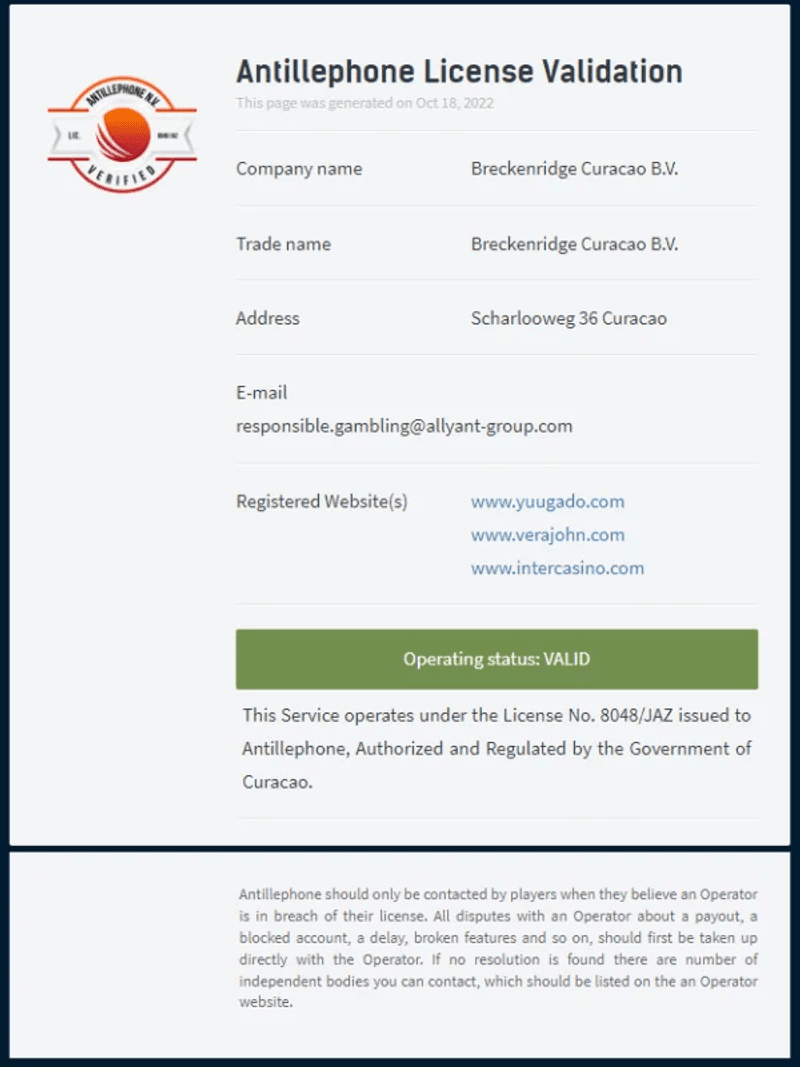 遊雅堂はキュラソーライセンスを取得し、合法的に運営されています。ベラジョンカジノ・インターカジノと同じBreckenridge Curacao B.V.が運営しており、SSL暗号化通信やRNG(乱数発生器)による公平性が保証されています。