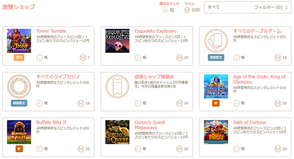 遊雅堂には、遊ぶほどお得になるマイレージプログラムが用意されています。 ゲームをプレイするたびにマイルが貯まり、貯まったマイルはフリースピンやボーナスと交換できます。
